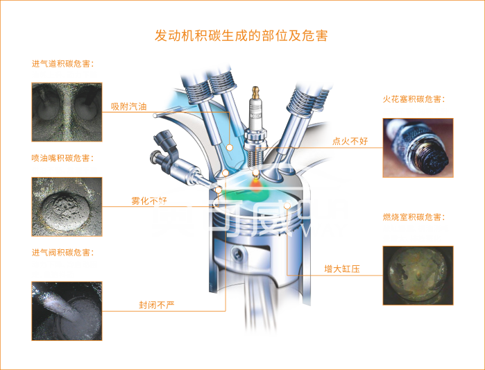 发动机发动机积碳严重时,可能引起“气门烧蚀、活塞烧顶、粘气门、早燃、爆燃、拉缸”等故障,甚至导致发动机报废。不仅危害车辆安全,更要支付昂贵的维修费用。