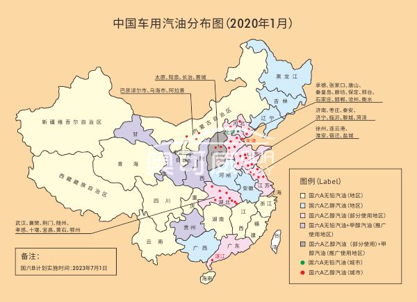 2018年12月31日,国家发展改革委、公安部、生态环境部、商务部、国资委、市场监督管理总局、国家能源局七部委联合发布公告,自2019年1月1日起,全国实施国六A车用汽油标准(含E10乙醇汽油)和国六车用柴油标准(含B5生物柴油)。