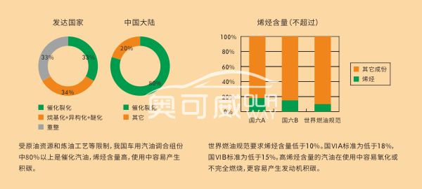 m。在炼制过程中,受深度脱硫、及含錳添加剂限制使用的影响,辛烷值严重下降。为此国五、国六车用汽油提升了高辛烷值组分——芳烃的实际含量。同烯烃一样,芳烃也是导致发动机积碳的主要原因之一。芳烃含量高的汽油使用中也容易产生积碳,而且形成的积碳结构较烯烃更致密,更难凊洗。