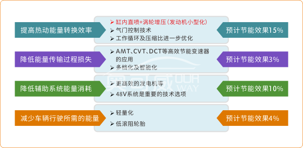 为应对中国汽车产业节能环保的发展需求,帮助汽车企业顺利实现乘用车燃料消耗量第五阶段标准,全国汽标委在经过大量的调研、分析和试验后,向汽车企业提供的发动机技术发展选项如下: